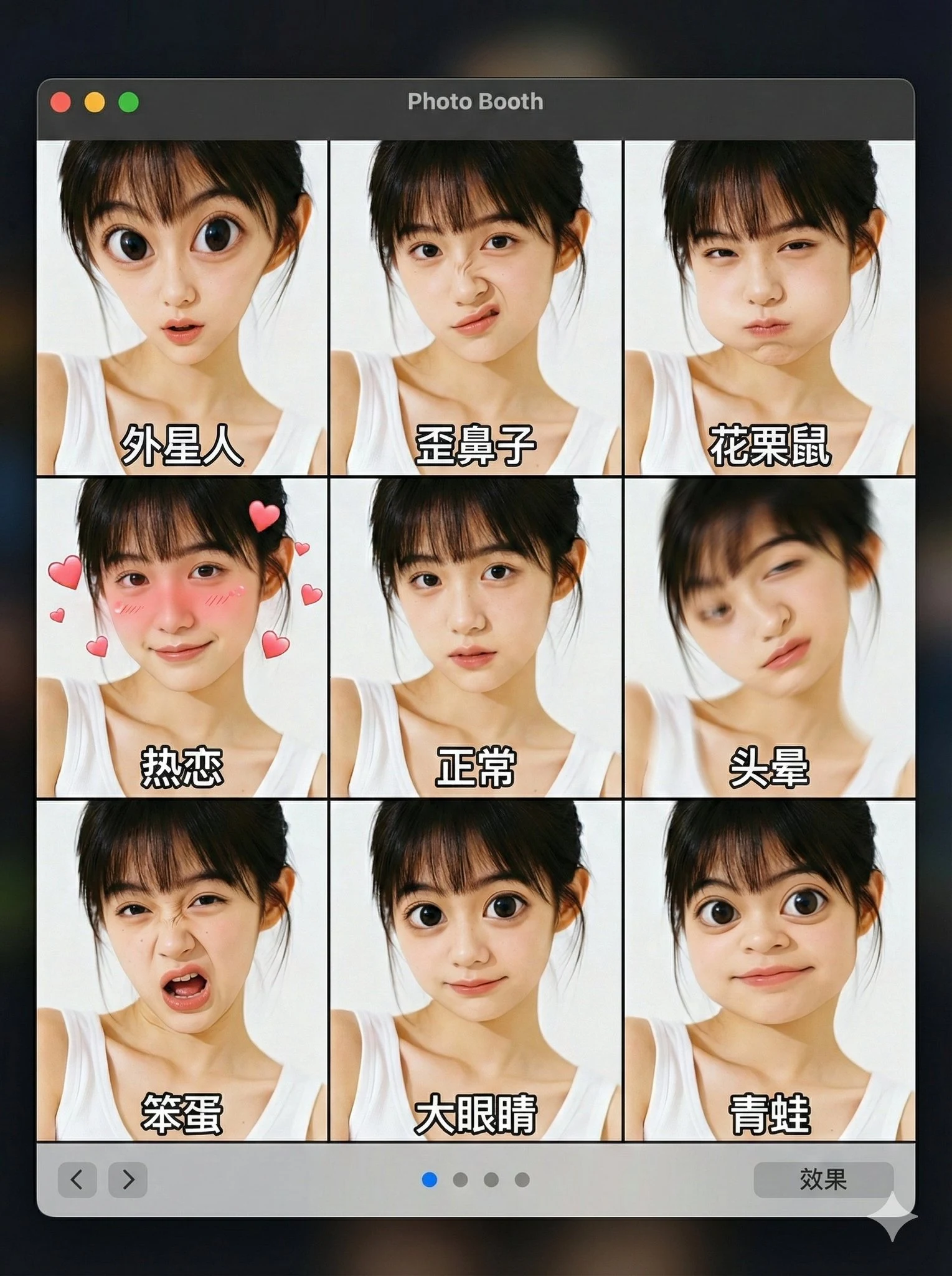 A complete screenshot of the MacOS Photo Booth application interface, with the top title bar displaying "Photo Booth". The main window has a 9-grid layout, and each grid shows a user-uploaded person with different funny effects applied. At the bottom of each grid, there are white Chinese subtitles: First row: Alien, Crooked Nose, Chipmunk; Second row: Madly in Love, Normal, Dizzy; Third row: Fool, Big Eyes, Frog. At the bottom is a gray control bar with left and right arrows, four navigation dots (the first one is blue), and an "Effects" button. The background is dark and blurred.