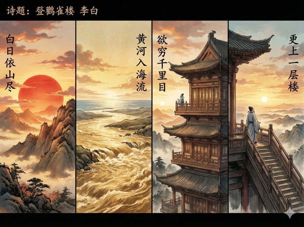 Create a captivating poetic visual composition based on this prompt, seamlessly integrating the four lines of the quatrain into a unified masterpiece. Each panel perfectly illustrates one line of the poem, with the corresponding verse and the poem’s title and author elegantly embedded within its respective scene using Chinese characters. Together, these panels form a harmonious and cohesive panoramic artwork. Rendered with rich detail, cinematic lighting, 8K resolution, and highly refined textures. --ar 4:3