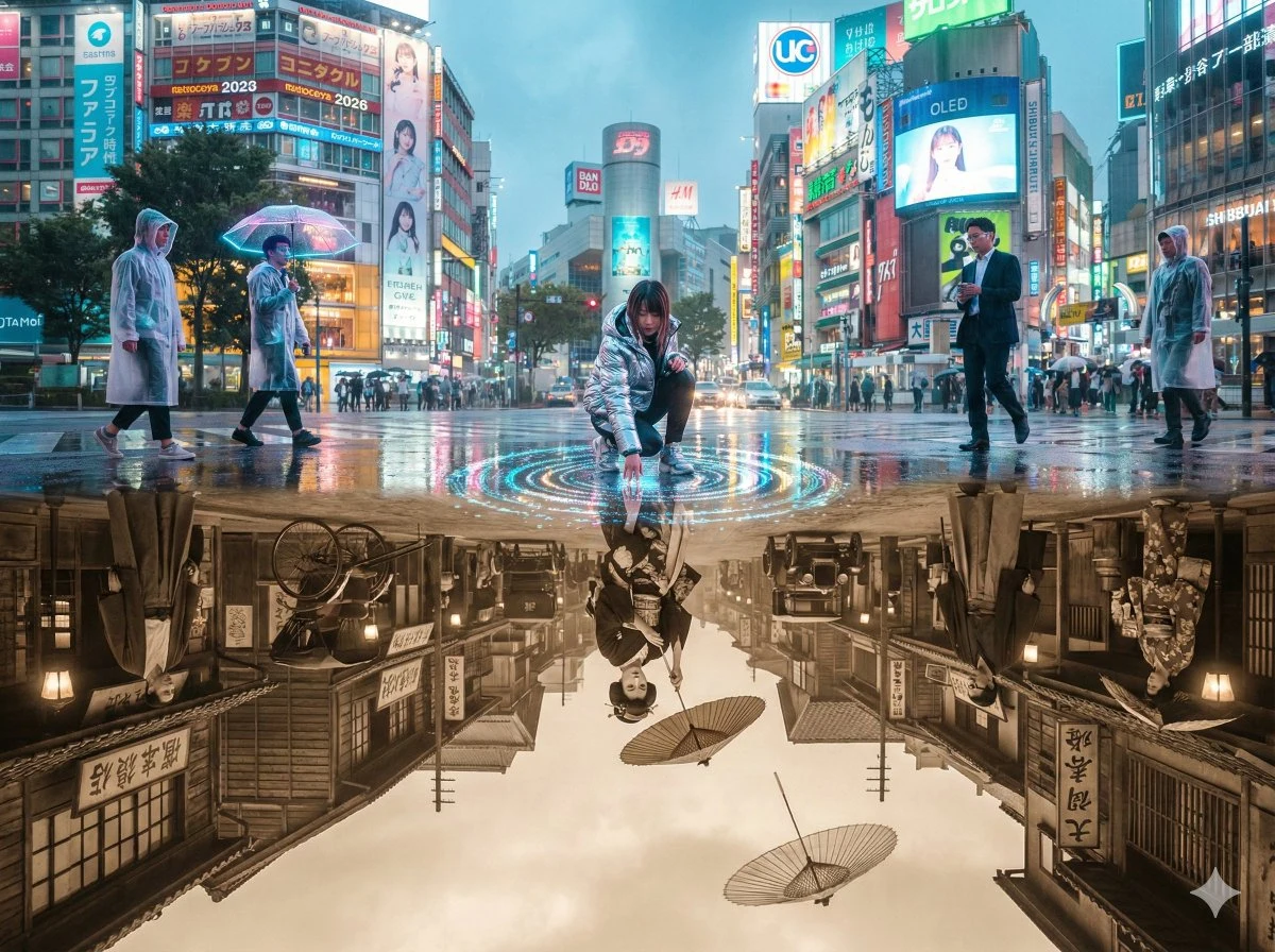 一位身穿铬色羽绒服的 2026 年女孩跪在水坑边,触摸着水坑;她的倒影是一位 1926 年的艺伎,正向上伸出手;她们的指尖在水面上相遇,激起完美的同心涟漪,最终变成闪闪发光的像素。