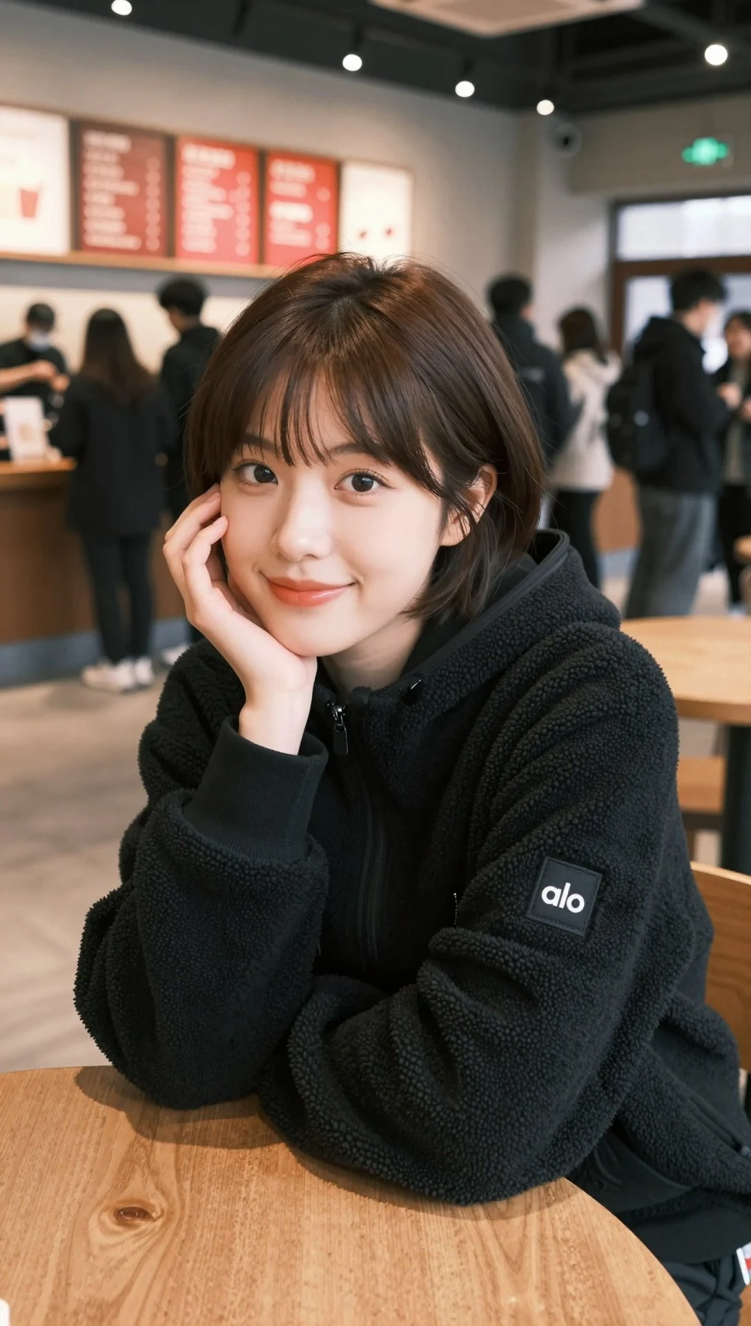 一张超写实的竖屏照片,视角略微俯视。画面主体是一位[目标角色特征],她正坐在咖啡店的浅色圆木桌前。她穿着黑色的半拉链高领抓绒卫衣,左侧袖子上有一个清晰的 "[服装品牌细节]" 标签。她身体前倾,单手托腮,手肘撑在桌上,眼神温柔地看向镜头。背景是虚化的繁忙咖啡店,可以看到天花板的轨道灯、远处红色的菜单板和模糊的顾客。光线为温暖的室内顶光,肤色自然,发丝清晰,具有极高的摄影质感。