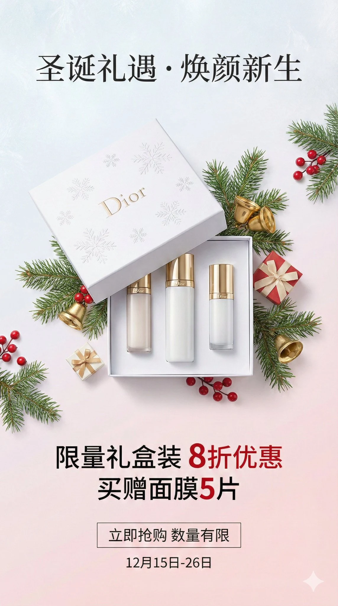 تصميم بطاقة دعائية احترافية لعبوات العناية بالبشرة الخاصة بعيد الميلاد، بتنسيق عمودي، مع أسلوب تصميم بسيط وأنيق. خلفية البطاقة تستخدم تدرجًا ناعمًا من اللون الأبيض الثلجي في الأعلى إلى اللون الوردي الفاتح في الأسفل، مما يخلق جوًا نقيًا وراقيًا. في المنتصف العلوي من الصفحة، تم وضع مجموعة من عبوات العناية بالبشرة الفاخرة بعناية، حيث تُغلف العبوات بألوان بيضاء مطورة، مع طباعة زخرفية للثلوج والشعار (Dior) على السطح. يتم فتح العبوة لعرض ثلاث زجاجات من المنتجات المختلفة في الحجم، ذات تصميم بسيط وحديث مع أغطية ذهبية. حول المنتجات تم ترتيب عناصر الديكور الخاصة بعيد الميلاد بدقة: بعض فروع الصنوبر الطازجة، جرس ذهبي صغير، بعض الثمار الحمراء، وأكياس هدية صغيرة متناثرة، مع إضاءة دقيقة لكل عنصر لتقديم جودة تصوير المنتجات الفاخرة. في الجزء العلوي من البطاقة، يتم كتابة العنوان الصيني "هدية عيد الميلاد · تجديد البشرة" بخط رقيق وأنيق. أسفل المنتجات في الوسط، يُكتب معلومات الترويج باللون الأحمر البارز: "عبوة محدودة 80% خصم + هدية 5 قطع من كريم التقشير". وفي الأسفل، يتم كتابة نص زر الدعوة للشراء بأسلوب زر: "اشتري الآن - الكمية محدودة" مع تاريخ الفعالية "15 ديسمبر - 26 ديسمبر". يركز التصميم العام على الجمع المثالي بين جودة المنتجات والجو العيدي. نسبة الأبعاد 9:16