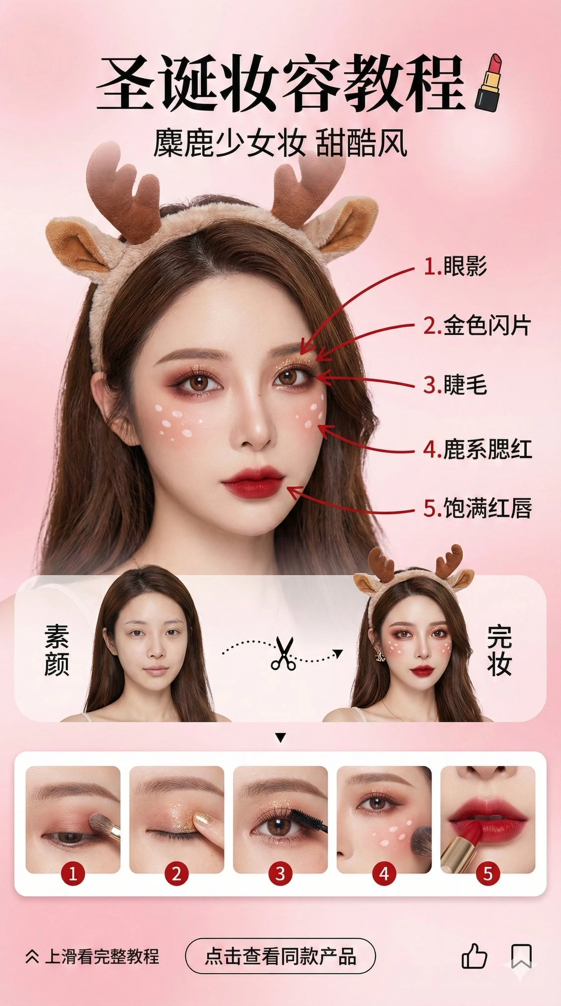 顶部: 中文标题“圣诞妆容教程”,搭配口红图标。副标题“麋鹿少女妆 甜酷风”。