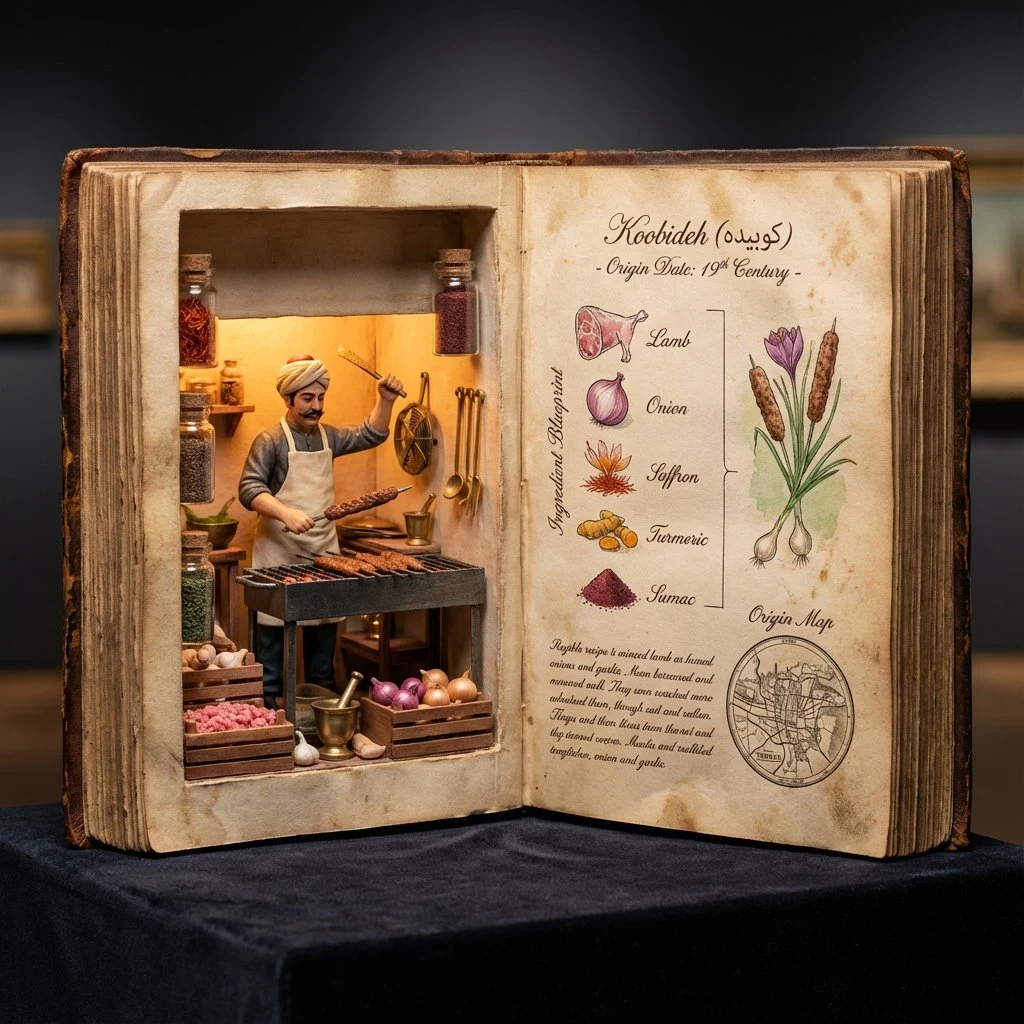 本の左側は秘密の隠し部屋のように空洞になっている。その中に驚くほど美しい3Dミニチュアシーンが収められている。料理の発明者を再現した非常に詳細な人形が、時代に合ったキッチンで動きの中を捉えている。その周囲には10〜15種類の主要な材料の微細なモデルがあり、それぞれが独自の手作りガラスボトルやマイクロサイズの木製ケースに入っている。また、当時の特徴的な小さなブロンズ製調理器具も含まれている。このシーンは、「ページ」内部から発する温かく神秘的な琥珀色の光で照らされている。