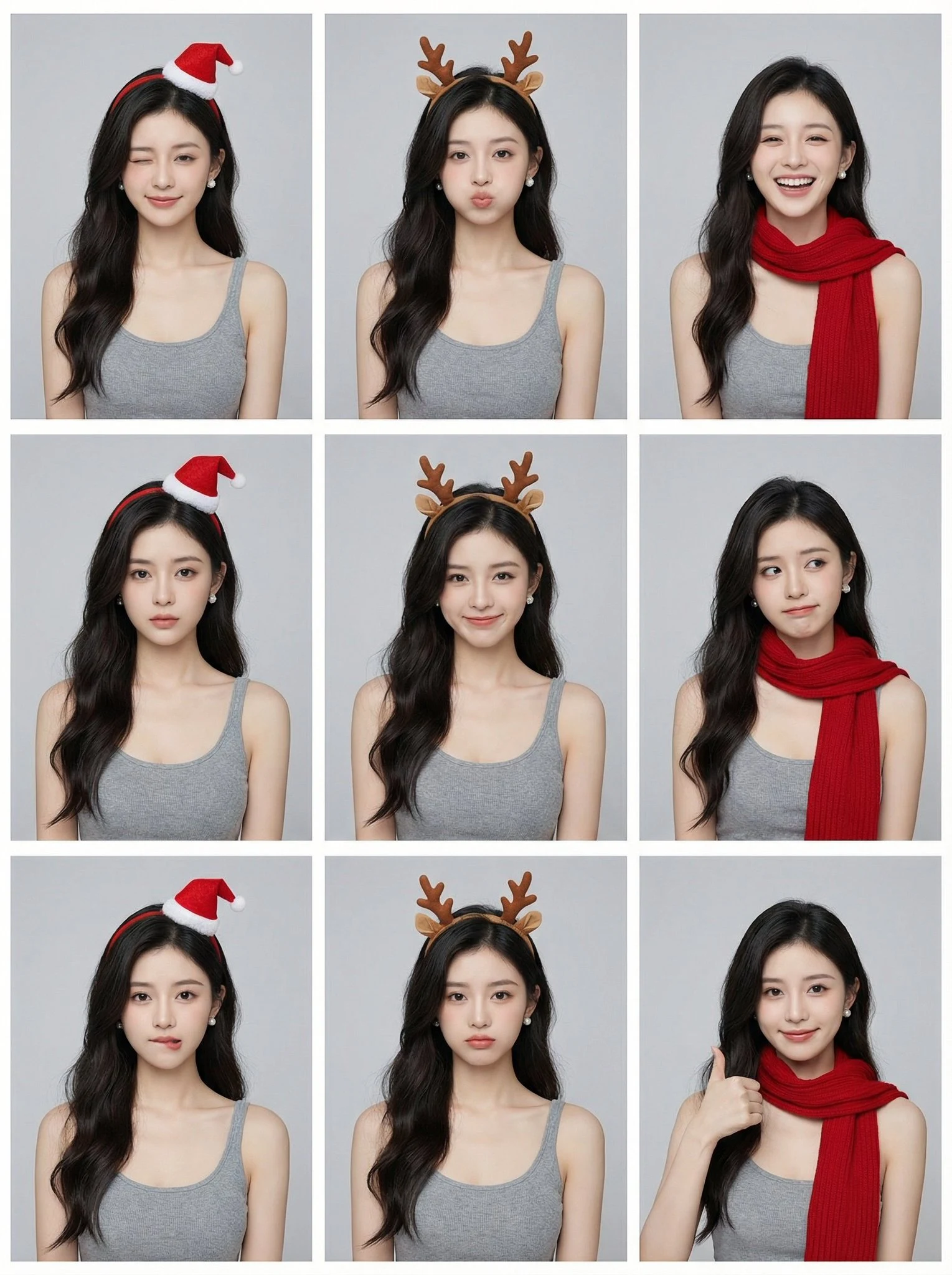 "subject_consistency": "Same young asian woman in all 9 panels, identical outfit, identical hairstyle",