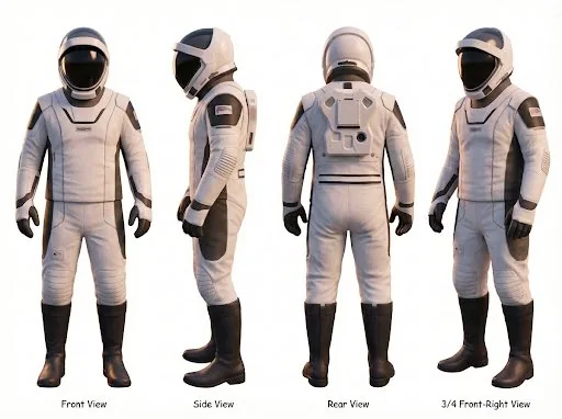Character sheet of a character from front, side, rear, and 3/4 turn view. Background solid white, filling the entire canvas. Use this as a reference and input it into @tripoai to let it create the 3D version.
