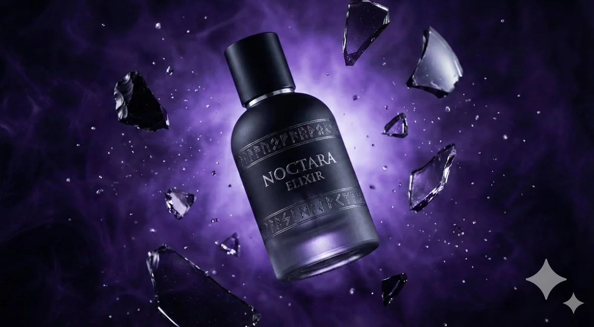 { "prompt": "一张基于 image_4.png 的高分辨率 8K 照片,展示了哑光黑色的“Noctara Elixir”瓶子,上面有银色的符文文字和细节。玻璃碎片和水滴更加锐利和细致,捕捉着光线。背景现在是深沉、浓郁的皇家紫色,带有旋转的烟雾和薄雾,取代了之前的深蓝色。灯光依然富有戏剧性,突出了瓶子和悬浮的元素,与新的紫色背景形成对比。" }