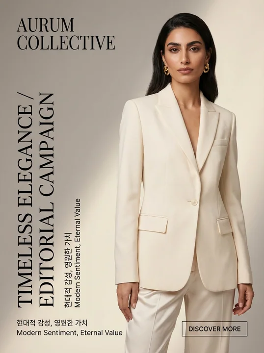 Single hero editorial fashion aesthetic, 3:4 vertical ratio. LAYOUT: Full-bleed editorial hero COMPOSITION: - Subject: Persian female model, luxury designer pieces, polished hair/makeup, confident pose - Position: Center-right with left text zone - Style: Confident, relaxed, editorial aesthetic SUBJECT STYLING: - Luxury designer pieces, premium fashion - Polished hair/makeup, confident pose - Statement jewelry piece BACKGROUND: - Type: Subtle gradient - Color: Neutral tones (cream, warm gray) - Treatment: Clean, non-distracting LIGHTING: - Style: Soft, diffused beauty lighting - Main: Large softbox, frontal - Fill: Reflector for shadow detail - Quality: Premium fashion photography COLOR PALETTE: - Quiet luxury aesthetic - Gold/brass accent elements - Low saturation, sophisticated TEXT OVERLAY: - Brand name: Elegant serif, upper-left corner - Headline/Collection: Left-side vertical stack - Tagline: Below headline, bilingual (KR/EN) - CTA: Bottom-right MOOD: Sophisticated, aspirational, premium, quiet luxury, editorial fashion STYLE: Vogue editorial aesthetic, Hasselblad medium format, 80mm f/2.8, natural window light + fill Keywords: editorial hero, fashion aesthetic campaign, luxury photography, editorial portrait, brand lookbook, premium advertising, quiet luxury, sophisticated style.