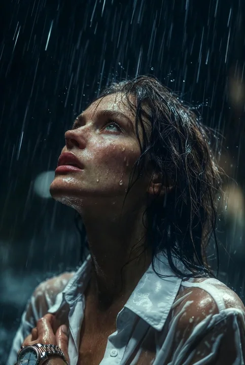 "output_goal": "Create a hyper-realistic cinematic night portrait of a woman standing in the rain, preserving her exact facial identity and hairstyle, with dramatic lighting, visible rain droplets, and an intense emotional atmosphere."