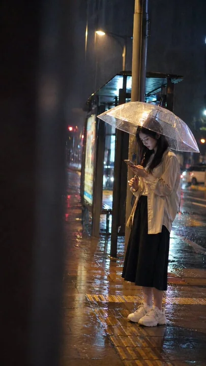 At a city bus stop on a rainy night, a young adult woman stands alone under the dim yellow streetlight and the bus stop light box, looking down slightly at her phone, not looking at the camera, showing a natural waiting state. She is wearing a light-colored thin jacket, a dark midi skirt, and white sneakers, with long hair falling naturally, holding a phone in one hand, and lightly holding a clear umbrella in the other hand. The character is located in the right third of the frame, with a blurred foreground obstruction on the left, like a momentary glimpse from the edge of a street crowd or a car window. The bus stop sign, advertising light box, streetlight pole, and the edge of the umbrella form clear vertical and diagonal lines, guiding the line of sight. The ground has rainwater reflections, and distant headlights and neon lights are blurred into soft light spots. The overall look is a mix of a cold blue rainy night environment and warm yellow streetlights, creating realistic city lighting, with soft top light and side light, without a strong posed feeling. Shallow depth of field makes the subject clear and the background slightly blurred, the image has a real camera grain feel, slight motion blur, and imperfect composition, presenting a candid snapshot of a real moment. The photo style is realistic and natural, not a portrait, not an advertising blockbuster, with no text watermark.