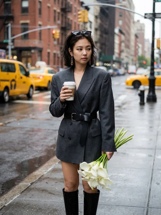 Cinematic street style editorial photograph, a young Korean woman resembling Blackpink Jennie standing on a rain-kissed New York City sidewalk, wearing an oversized double-breasted charcoal gray blazer as a mini dress with padded shoulders, bare legs, black patent leather knee-high boots, wide black leather belt cinching the waist. She holds a white takeaway coffee cup in her left hand and a lush bouquet of white calla lilies in her right hand. Gold oversized chain earrings, black cat-eye sunglasses pushed up on her head. Her dark hair styled in a tousled effortless bob with slight waves. She gazes off-camera with a cool unbothered expression. Background features a blurred urban streetscape with yellow taxi cabs, traffic lights, and wet reflective pavement. Overcast moody daylight, shallow depth of field, sharp focus on the subject. Muted gray and black palette with gold accents, power chic fashion editorial aesthetic, shot on Sony A7R V, 85mm f/1.4, 8k detail, photorealistic.