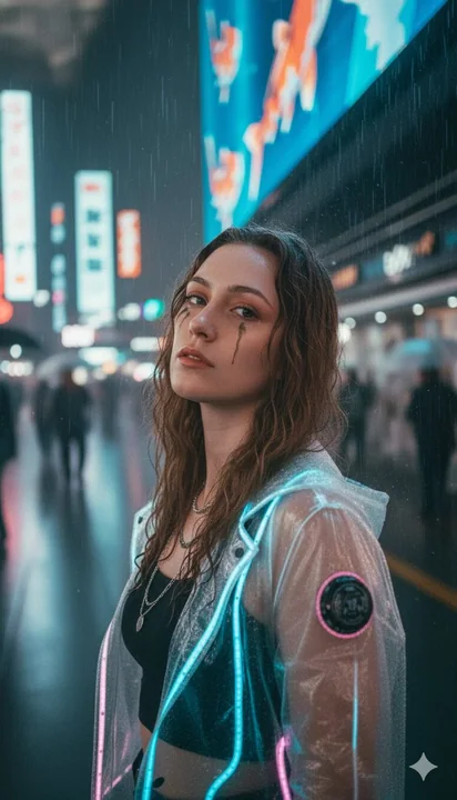 雨夜中,一名参考女孩站在巨大的全息锦鲤广告牌下,特写镜头捕捉到她未经修饰、富有电影感的画面。地点是新宿上部的步行街。请**仅**使用上传的自拍作为面部参考。她的湿发紧贴脸颊,睫毛膏略微晕染,眼神平静而专注地向上凝视。她穿着半透明的雨衣,上面有发光的青色-洋红色 LED 线条,内搭黑色露脐上衣,佩戴银色链条。雨滴在镜头上形成条纹,霓虹灯的颜色在皮肤上晕开,身后是模糊的伞下人群。风格:忧郁赛博朋克写实主义,强烈的轮廓光,体积光线,高对比度,电影颗粒感,浅景深。