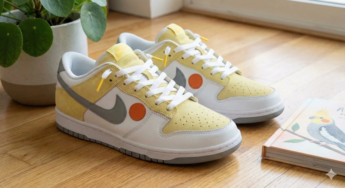 Sneakers modeled after a cockatiel, as envisioned by AI. The detail is fine, even expressing the cheek patches.