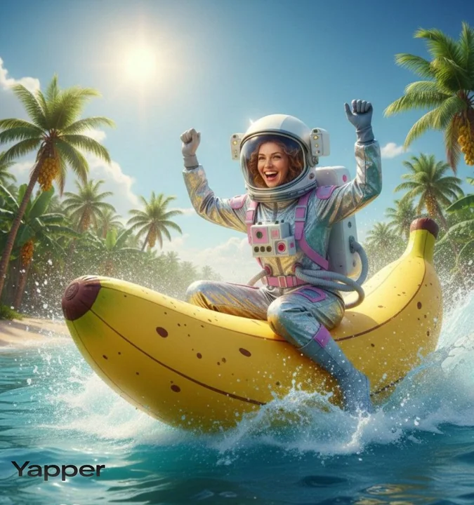 A glowing banana-shaped float soaring forward like a rocket through space, leaving a trail of tiny sparkling particles that resemble cosmic dust. The character cheerfully waves with pride while flying. The camera tracks smoothly from behind, following the motion, creating a dynamic cinematic feel. Add playful, lighthearted sci-fi sound effects to enhance the fun, adventurous atmosphere.