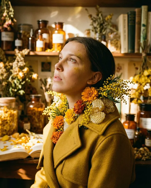 { "vibe_title_en": "Organic Golden Alchemy", "master_prompt": "A hyper-realistic cinematic close-up of The Protagonist in a side-profile view, looking upward with a longing gaze, set inside a chaotic and sun-drenched Saffron Preservation Atelier. The environment is extremely busy and cluttered (Busy Environment Mode), filled with floor-to-ceiling shelves stacked with amber glass jars, bundles of dried yellow herbs, crumbling botanical encyclopedias, and scattered golden petals. The Protagonist wears a heavy, textured wool trench coat in mustard yellow that surrealistically morphs into a living collar of blooming marigolds, mimosa flowers, and crystallized honeycomb structures (Photographic Surrealism). The lighting is directional and warm, mimicking a 'golden hour' shaft of light that highlights microscopic skin pores, dusting of yellow pollen on the cheeks, and the fibrous texture of the coat. Shot on a Hasselblad H6D-100c with an 80mm f/2.8 lens to create a shallow depth of field that blurs the dense background clutter while keeping the eye and floral textures razor-sharp. Kodak Portra 400 film stock emulation, fine grain, organic warmth, tactile atmosphere.", "meta": { "intent": "Editorial Fashion x Surrealism", "priorities": "Texture, Monochromatic Color, Busy Background, Photorealism", "device_profile": "High-End Desktop / Large Format Print" }, "frame": { "aspect": "4:5", "composition": "Rule of Thirds, Side Profile", "layout": "Subject dominated foreground, dense background", "camera_angle": "Eye-level, slightly tilted upwards", "tilt_roll_degrees": "0" }, "subject": { "gender": "Female", "identity": "The Protagonist (Universal Template)", "demographics": "Adult, Age-Neutral", "face": "Neutral expression, slight parting of lips, gazing upward", "hair": "Pulled back, integrated with surreal floral elements", "body": "Shoulders and head visible (Bust shot)", "expression": "Dreamy, longing, focused on a distant point", "pose": "Leaning slightly back, chin lifted, side profile" }, "wardrobe_accessories": { "garments": [ { "item": "Trench Coat", "material": "Heavy Wool / Felt", "color": "Mustard Yellow / Ochre", "fit": "Oversized, Structured" } ], "accessories": [ { "item": "Surreal Living Collar", "color": "Golden Yellow / Orange", "material": "Living Marigolds, Mimosa, Honeycomb Wax", "brand_style": "Avant-Garde Nature Fusion" }, { "item": "Scarf", "color": "Muted Gold", "material": "Vintage Silk with Paisley Pattern", "brand_style": "Bohemian Luxury" } ] }, "environment": { "setting": "Saffron Preservation Atelier", "surfaces": "Plaster walls, wooden shelves, glass jars, paper stacks", "depth": "Shallow depth of field, background cluttered but soft" } }