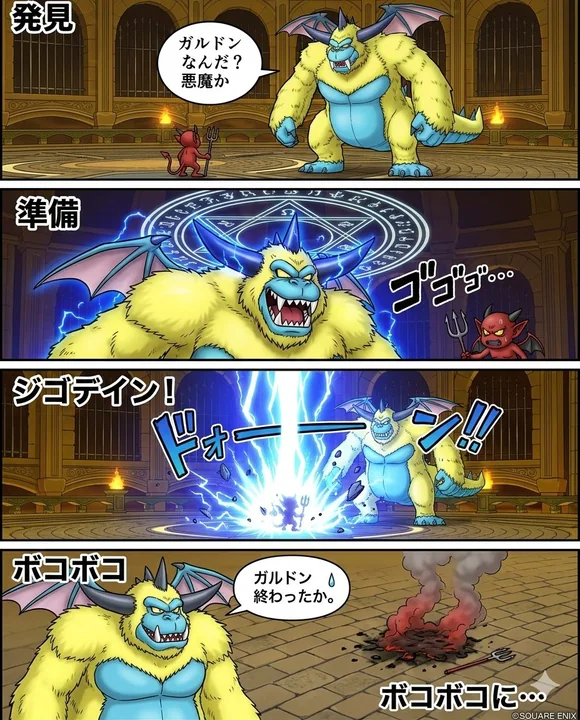 Galdodon découvre un démon. Galdodon dit : « Quoi ? Un démon ? » Galdodon tire Jigodein. Battre le démon... 4 cases verticales. Bande dessinée à 4 cases.