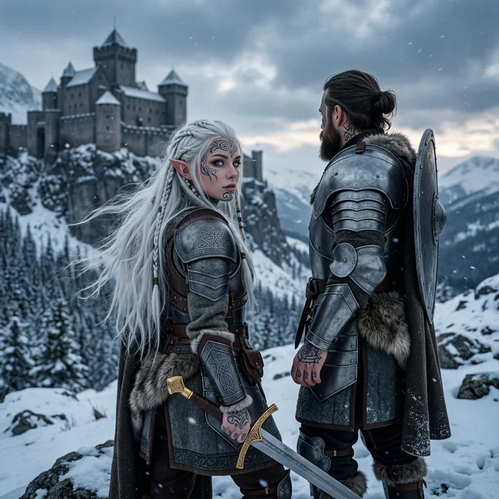 Portrait hyperréaliste d'un couple de beaux elfes tatoués et guerriers. Hiver, neige, une femme tenant une épée. Un château en arrière-plan. La femme elfe a des tatouages, des yeux bleus, des cheveux blancs longs et portant une armure chevaleresque.