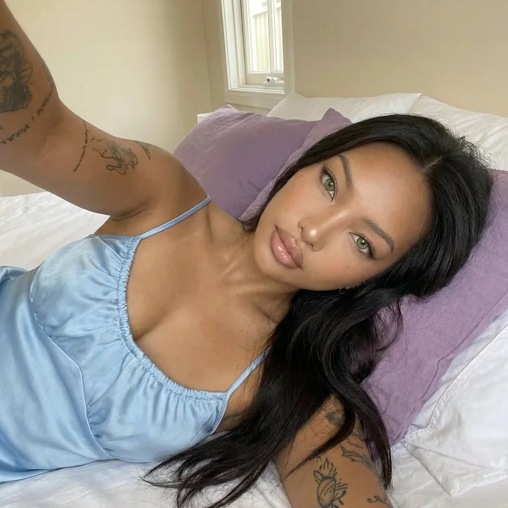 { "prompt": "Intimate bedroom selfie portrait, young woman with long dark wavy hair, lying on pink bed with purple pillows, head resting on pillow, taking selfie from above looking up at camera with soft dreamy expression, wearing light blue satin camisole top with thin spaghetti straps and gathered ruched neckline, natural minimal makeup with soft pink blush, glossy nude pink lips, light green eyes with natural lashes, fair porcelain skin, hair spread out on white bedding, one arm behind head, relaxed lazy morning pose, soft natural daylight from window, warm intimate cozy mood, iPhone selfie style close-up portrait, bedroom with cream beige walls visible in background", "negative_prompt": "outdoor, studio lighting, heavy makeup, dark hair, standing pose, full body, harsh shadows, nighttime, formal setting", "style": "intimate lifestyle selfie, soft romantic mood, natural beauty portrait, cozy morning aesthetic", "aspect_ratio": "3:4", "camera": { "type": "smartphone front camera selfie", "angle": "above subject looking down, close-up selfie angle", "framing": "close-up portrait, face shoulders and upper body visible" }, "lighting": { "type": "soft natural window daylight", "quality": "warm soft diffused morning light, gentle even illumination", "atmosphere": "intimate cozy bedroom morning light" }, "mood": "intimate, soft, dreamy, relaxed, cozy, lazy morning", "color_palette": "platinum white blonde, light blue satin, white bedding, cream beige walls, soft warm skin tones", "subject_features": { "hair": "long dark hair, soft wavy curls, spread out on the pillow and bedding, natural tousled texture", "skin": "fair, porcelain, natural soft glow, minimal blemishes", "eyes": "light green, soft gaze looking up at camera, natural lashes", "lips": "glossy nude pink, full natural soft shape", "eyebrows": "natural brown, well groomed soft arch", "expression": "soft, dreamy, relaxed, slight pout, intimate gentle gaze" }, "makeup": { "style": "natural minimal makeup", "base": "natural skin, light coverage", "cheeks": "soft pink natural blush", "eyes": "minimal eyeshadow, natural lashes", "lips": "glossy nude pink" }, "wardrobe": { "top": "light blue satin camisole, thin spaghetti straps, gathered ruched elastic neckline, silky shiny material" }, "pose": { "position": "lying on back on bed, head on white pillow", "arms": "one arm bent behind head on pillow", "gaze": "looking up at camera above", "hair": "spread out flowing on white bedding" }, "setting": { "location": "bedroom", "bed": "white sheets, white fluffy pillows", "background": "cream beige colored walls, doorway visible", "atmosphere": "cozy intimate morning bedroom setting" } }