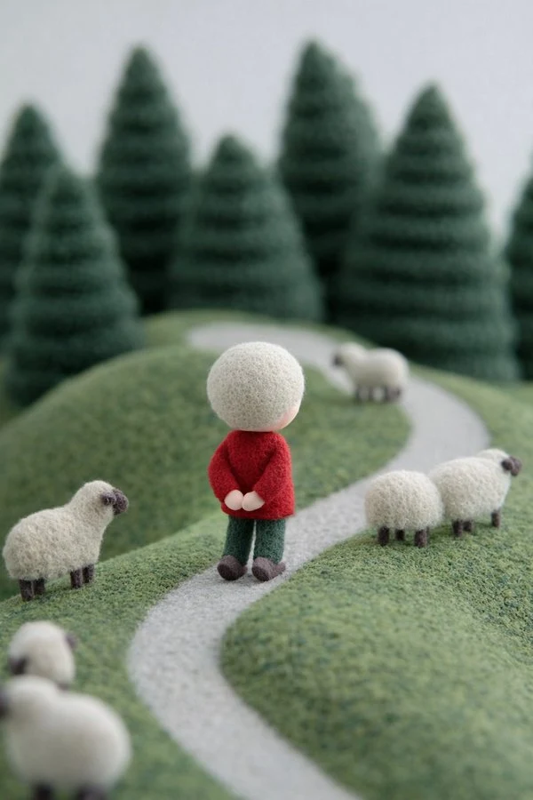 "material_style": "needle-felted wool / soft fiber miniature",