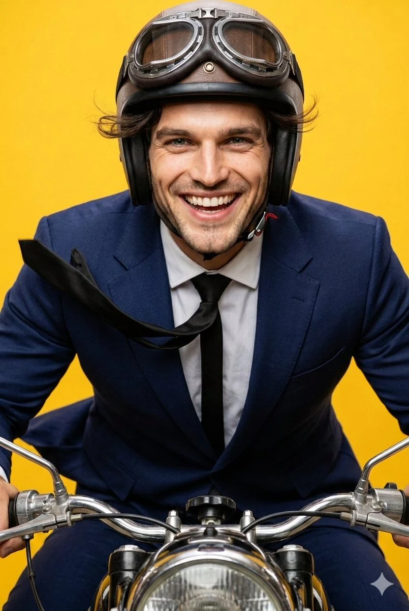 A very realistic photograph of a person sitting on a motorcycle, seen from the front. The person wears a formal suit, tie and a vintage helmet, his face shows great happiness. The wind blows visibly against their face and suit, creating a dynamic sensation of movement, as if they were traveling at high speed. The overall scene should be on a vibrant yellow background, capturing the realism of a person enjoying a motorcycle ride, with a clear focus on facial expression and the effect of the wind. Captured with the Canon EOS R5 camera with high resolution and ultra-realistic details 一张非常写实的照片,一个人坐在摩托车上,从正面观看。这个人穿着正式的西装、打着领带并戴着复古头盔,脸上流露出巨大的幸福感。风明显地吹向他们的脸和西装,营造出一种动态的运动感,仿佛他们正在高速行驶。整体场景应处于充满活力的黄色背景上,捕捉一个人享受摩托车骑行的真实感,清晰聚焦于面部表情和风的效果。使用佳能 EOS R5 相机拍摄,具有高分辨率和超写实的细节。