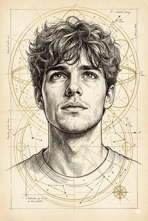 一幅高度细致、手绘的科技风格插画,描绘了一位年轻人仰望天空,神情充满希望且专注。他的脸部以精细的交叉影线描绘,突出了面部结构和情感。头发凌乱而富有动感,发丝以水墨速写风格呈现。肖像周围环绕着金色的几何图案、星体光环和星座般的线条,赋予其科学与精神融合的意境。