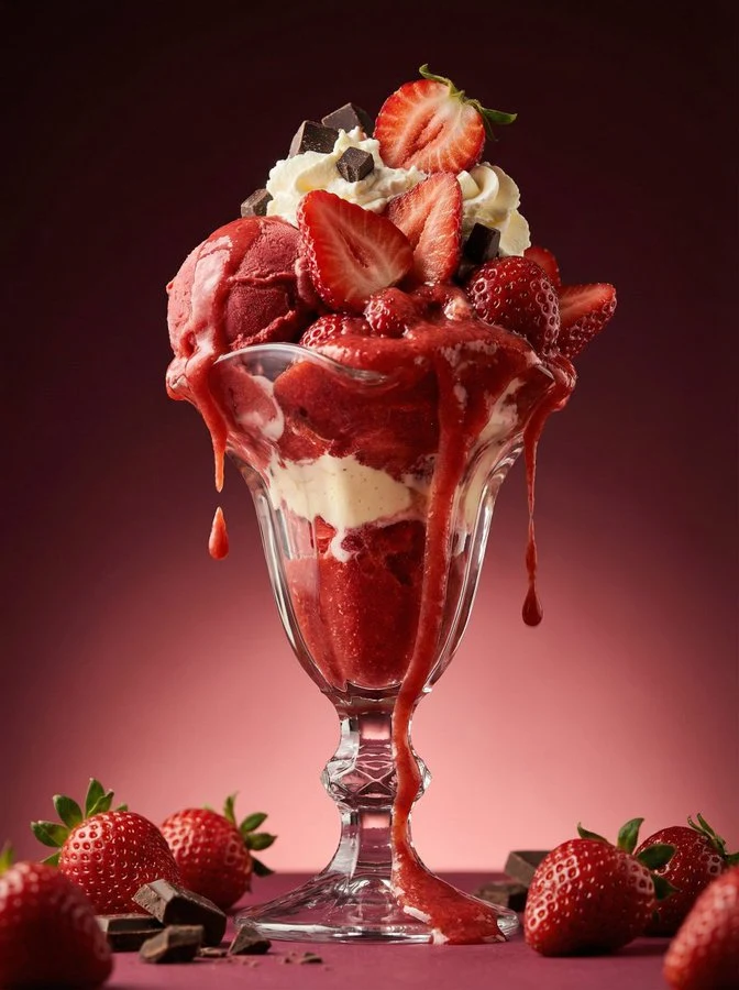 Flavor theme: 【Strawberry】. Ultra-premium dessert advertising poster, hyper-realistic and intensely mouth-watering. A tall crystal sundae glass centered, filled with a rich creamy dessert inspired by the flavor theme, paired with multiple distinct complementary ingredients from the same flavor profile and color palette, clearly different in form, texture, or preparation, even when the flavor theme itself is visually obvious; for visually ambiguous or dairy-based flavors, include clearly recognizable solid garnish elements derived from the flavor itself. Ice cream scoops appear dense, cold, and creamy with soft melting edges. Flavor-matched liquid splashes originate clearly from inside the glass, bursting upward and outward from the dessert itself, thick, glossy, and gravity-driven, flowing in irregular ribbons and droplets, coating the rim and inner walls of the glass in slow motion. Fruits or accents appear juicy with visible moisture, some placed in the foreground for depth. Seamless infinite studio background in a refined mid-to-dark tone, clean and texture-free, softly lit with subtle tonal gradients, color-matched to the flavor theme. Cinematic lighting, shallow depth of field, high-end commercial aesthetic, indulgent yet refined, hyper-detailed, 8k quality. No text, no logo, no watermark, no packaging, no frame, no CGI or cartoon look. 风味主题:【草莓】。超高端甜品广告海报,超写实且极度诱人。画面中央一只高身水晶圣代杯,盛满以风味主题为灵感的浓郁奶油甜品,搭配多个同属该风味与色彩体系、形态/质地/制法明显不同的互补配料;即使风味本身视觉辨识度已高,也仍需呈现清晰可辨的固体装饰元素。冰淇淋球致密、冷冽、奶油感十足,边缘柔软微融。与风味同色的液体飞溅明确源自杯内,从甜品本身向上向外爆发,厚重、光亮、受重力牵引,以不规则丝带与液滴形态缓缓覆盖杯口与内壁。水果或点缀物水润多汁、肉眼可见水分,部分置于前景营造景深。无缝无限延伸的摄影棚背景呈精致中深色调,干净无纹理,柔光照射带微妙渐变,与风味主题色彩匹配。电影级灯光、浅景深、高端商业美学,奢华而优雅,超精细,8K画质。无文字、无标志、无水印、无包装、无边框、无CGI或卡通观感。