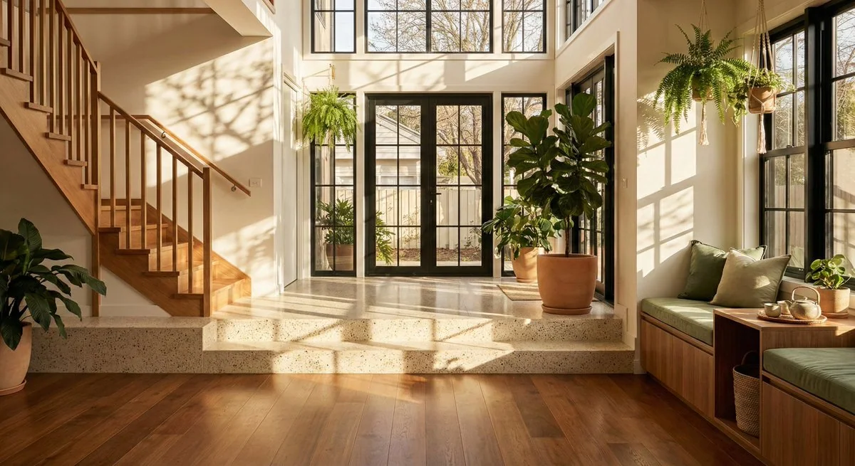 تصوير فوتوغرافي معماري لمدخل حديث مُضاء بالشمس، يتميز بتصميم أرضية مُقسّمة إلى مستويين. في المقدمة، تتحول الأرضيات الخشبية المُلمعة الملونة إلى منصة مُرفوعة تحتوي على سلم مغطى ببلاط تيرازو فاتح اللون ومُزخرف بالبقع. يصعد السلالم الخشبية ذات الخطوط النظيفة من اليسار. يغمر المكان ضوء طبيعي دافئ ينبع من النوافذ والبوابات الفرنسية في الخلفية، مما يخلق ظلال فنية مميزة من فروع الأشجار على الأرض. تضيف النباتات المزروعة داخل المنزل، بما في ذلك شجرة فيكس كبيرة، لمسة من اللون الأخضر النابض. على اليمين، توجد مقعد خشبي مُستخدم كخزانة لتخزين الأشياء مُزود بوسائد خضراء فاتحة، وطاولة جانبية تحوي مجموعة فضلات الشاي، مما يشير إلى منطقة معيشة مريحة. تهيمن الألوان الدافئة والطبيعة على التصميم، حيث تظهر ألوان البني، والأبيض الفاتح، والبيج، والكريم. الصورة واضحة وعالية الدقة، وتُظهر جوًا هادئًا ومفتوحًا مميزًا كالذي تجده في المجلات الخاصة بالتصميم الداخلي. ## الموضوع والخصائص الموضوع الرئيسي: المدخل الداخلي ومجال المعيشة نوع الموضوع: معماري/تصميم داخلي المظهر: خطوط نظيفة، أرضية مُقسّمة، مساحة مفتوحة ملحقات: لوحة فنية لنباتات مُصورة، أوعية خزفية، مجموعة فضلات الشاي، ووسائد الإجراء: مشهد معماري ثابت المقياس: مقياس معماري ## تحليل الإضاءة نوع الإضاءة: ضوء طبيعي اتجاه الإضاءة: من الجهة الجانبية والخلفية من النوافذ جودة الإضاءة: ضوء قوي يمر عبر الأشجار مُشكّلًا أنماطًا مُتقطعة درجة حرارة الإضاءة: درجة حرارة ذهبية دافئة (حوالي 3500K-4000K) الظلال: ظلال واضحة وعالية التباين من فروع الأشجار على الأرض الناصع: ناصعات الشمس على التيرازو والخشب الوقت: وقت متأخر من بعد الظهر أو وقت مبكر من الصباح ترتيب الإضاءة: إضاءة طبيعية محيطية مع إضاءة قوية وواضحة من الشمس ## تحليل الألوان الألوان الأساسية: #8B5A2B (خشب متوسط)، #E8E0D5 (تيرازو كريم)، #F5F5F0 (جدران بيضاء فاتحة)، #4A6B4A (أخضر أوراق)، #CCA878 (ذهبي شمس) تحليل الألوان: ألوان دافئة مماثلة مع لمسات خضراء ألوان التصميم: ألوان طبيعية درجة حرارة الألوان: دافئة التباين: متوسط إلى عالٍ بسبب تفاعل الضوء والظلال كثافة الألوان: طبيعية، دافئة ونابضة تدرج الألوان: طبيعية، ديكور داخلي دافئ ألوان التأكيد: النباتات الخضراء، الألوان الملونة في التيرازو ## التكوين والكاميرا زاوية الكاميرا: مستوى العين نوع التصوير: تصوير داخلي واسع النطاق طول البؤرة: 24 مم أو 35 مم واسع النطاق عمق المجال: عمق كبير (f/8 أو f/11) منظور: منظور نقطة واحدة قاعدة الثلث: السلالم في الثلث الأيسر، الشجرة في الوسط الأيسر، الأثاث في الثلث الأيمن خطوط القيادة: أرضيات الأرض وسياح السلالم تشير إلى الباب الخلفي التماثل: توازن غير متناسق الفراغ السلبي: استخدام متوازن، شعور مفتوح عناصر التكوين: السلالم من اليسار، الأثاث الخشبي من اليمين前景: أرضية خشبية وحواف الأثاث متوسطة: منصة تيرازو وشجرة داخلية كبيرة خلفية: بوابات فرنسية تؤدي إلى حديقة خضراء ## البيئة والمكان نوع الموقع: مدخل داخلي في منزلي نوع المكان: منزل حديث مع وصول إلى حديقة الطقس: مشمس وواضح الجو: نظيف ومليء بالشمس وسالم الموسم: ربيع أو صيف