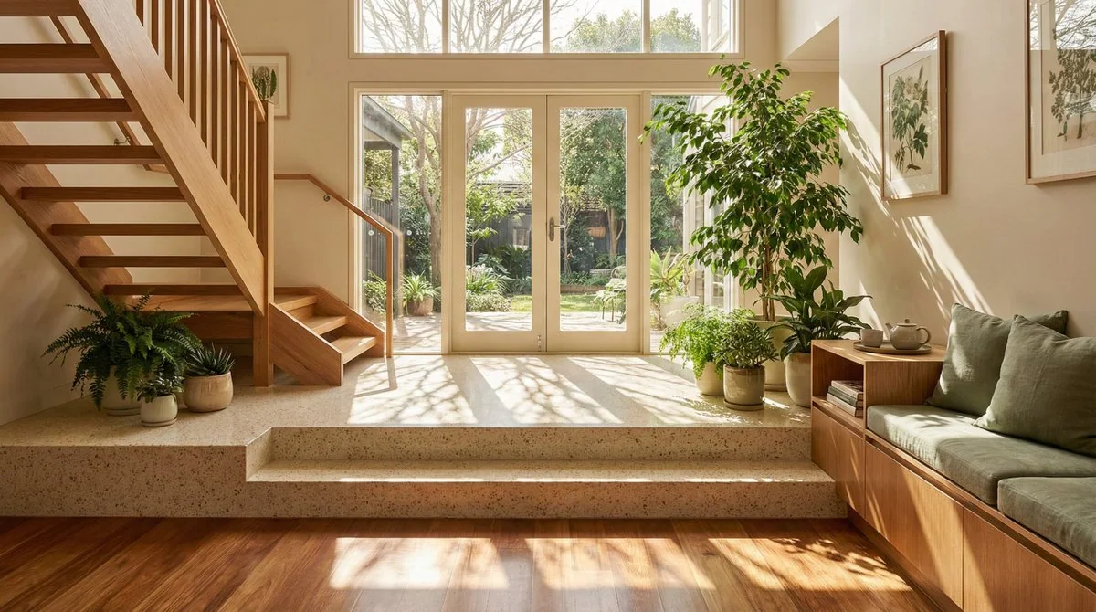 { "prompt": "一幅阳光普照的现代入口建筑摄影作品,采用错层式设计。前景中,光亮的深色木地板过渡到一个高起的平台,平台铺设着带有斑点米色水磨石台阶。左侧是线条简洁的木制楼梯。暖和的自然阳光透过后方的法式门窗倾泻而入,在地面上投射出清晰、富有艺术感的斑驳树影。郁郁葱葱的室内盆栽植物,包括一棵大型榕树,增添了鲜活的绿色点缀。右侧是一个带有鼠尾草绿色坐垫的木制储物长凳,以及一个摆放着茶具的边桌,营造出舒适的起居区域。整体色调以温暖的大地色系、米色、木色和奶油色为主。图像清晰、高分辨率,捕捉到高端室内设计杂志中常见的宁静、通透的氛围。", "subject": "阳光普照的现代室内门厅,特色是水磨石台阶、木地板和丰富的室内植物。", "style": "当代建筑摄影、室内设计展示、暖色系极简主义。", "lighting": "自然阳光透过窗户倾泻而入,在地面上形成独特的斑驳树影。", "colors": "暖中性色、丰富的木棕色、奶油米色、鼠尾草绿色、白色高光。", "composition": "广角平视拍摄,展现了从入口到花园门的深度,由楼梯和家具构图。", "environment": "高档住宅室内、连接花园的开放式起居空间。", "mood": "宁静、温馨、平和、通透、居家幸福。", "technicalQuality": "高分辨率、锐利对焦、出色的动态范围、照片级真实感。", "subjectDetails": { "mainSubject": "室内入口和起居空间", "subjectType": "建筑/室内设计", "accessories": "带框植物艺术品、陶瓷花盆、茶具、坐垫", "action": "静态建筑场景", "appearance": "线条简洁、错层地板、开放式布局", "scale": "建筑尺度" }, "lightingDetails": { "lightType": "自然阳光", "direction": "来自窗户的侧光和背光", "quality": "透过树木过滤的强烈阳光形成斑驳图案", "highlights": "水磨石和木材上的明亮阳光斑块", "lightingSetup": "自然环境光填充与强烈定向阳光", "shadows": "地面上清晰、高对比度的树枝阴影", "temperature": "温暖的黄金时段(约 3500K-4000K)", "timeOfDay": "傍晚或清晨" }, "colorAnalysis": { "dominantColors": [ "#8B5A2B (中等木色)", "#E8E0D5 (奶油水磨石)", "#F5F5F0 (米白色墙壁)", "#4A6B4A (叶绿色)", "#CCA878 (阳光金色)" ], "colorPalette": "带有绿色点缀的类似暖色调", "saturatio": "中等饱和度,营造柔和、自然的外观" } }