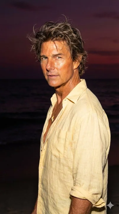 Create a beachy look of me like I'm on a beach where it's dark but someone took my picture with a flash, making my face sun-kissed, slightly glittery, and glowing. In the background, add a sunset where the sun has 98% set, leaving a deep purple-red sky, almost dark. The image is taken from behind my back as I turn toward the camera. I'm wearing a light yellow, loose, half-open linen shirt with sleeves rolled up, paired with a subtle gold seashell necklace. My hair is windswept, giving natural surfer vibes. The picture is cropped from above the waist, focusing on the upper body and glowing beachy aesthetic. 9:16 ratio
