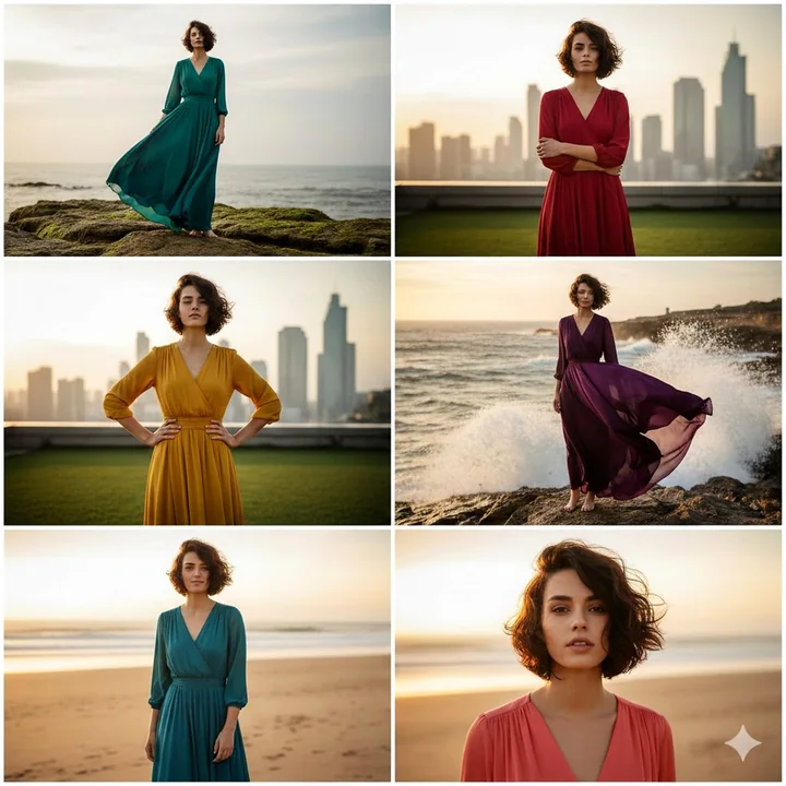 Un collage en grille 3x2 montrant la même jeune femme dans six portraits différents, portant des robes fluides jusqu'aux chevilles de différentes couleurs (verte, rouge, jaune moutarde, violette, bleue turquoise, rose corail). Elle a les cheveux courts et sombres, un maquillage naturel et un regard confiant et calme. Chaque panneau montre une pose et un lieu différents : Debout sur des rochers côtiers, robe verte, horizon doux et brumeux ; Debout sur un jardin sur le toit avec un ciel urbain flou, robe rouge, bras croisés ; Debout sur l'herbe d'un toit avec un horizon, robe jaune moutarde, mains sur les hanches ; Sur des rochers côtiers avec des vagues, robe violette dansant sous le vent ; Sur une plage de sable au coucher du soleil, robe turquoise, souriant doucement, lumière dorée chaude ; Portrait rapproché de la plage au coucher du soleil, robe rose corail, lumière douce sur le visage. Éclairage : heure dorée cinématographique, tons chauds doux, brume légère. Style : photographie ultra-réaliste, mise au point peu profonde, texture de peau naturelle, gradation douce des couleurs. Composition : bordures blanches espacées uniformément, mise en page carrée, aspect d'un reportage mode. Appareil photo : objectif de 50 mm, cadre corporel complet, mise au point nette, photographie professionnelle de portrait.** ✅ Prompt négatif (important) « flou, faible résolution, membres supplémentaires, visages en double, mains déformées, ombres trop fortes, couleurs sur saturées, texte, filigrane, logo, décalage de cadre »