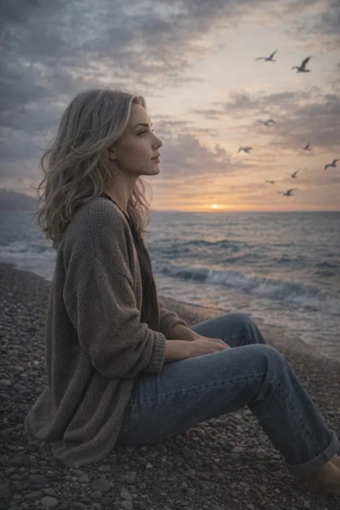 日落时分的海边电影场景,天空充满戏剧性的云彩。色调融合了冷蓝色调的灰蒙蒙大气,地平线附近泛着柔和的桃色光芒。人物侧身坐在布满鹅卵石的海滩上,靠近海岸线,身体朝向大海,目光凝视水面。姿势自然放松,符合人体解剖学,没有夸张的造型。轻柔的海风营造出微妙的环境动态——衣物轻柔摆动,与周围环境自然互动。海鸥在空中盘旋,部分带有轻微的运动模糊,以实现逼真的景深和空间分层。服饰简约中性:深色基本款 T 恤内搭宽松针织开衫,配以宽松直筒牛仔裤。面料必须展现逼真的纺织品特性——可见的针织纹理、自然的褶皱、重量、肘部和腰部的重力张力、真实的牛仔布结构和缝线细节。光线是柔和的自然日落光,具有逼真的衰减。来自地平线的微妙轮廓光,皮肤曝光平衡,不过度平滑。阴影保持哑光和立体感。以摄影师的视角拍摄——35 毫米镜头效果,自然透视,景深较浅但真实可信。复古胶片风格的色彩科学,让人联想到 Kodak Portra 400:柔和对比度,柔和高光,哑光阴影,轻微去饱和,有机胶片颗粒。编辑式构图,高照片真实感,4K 分辨率。