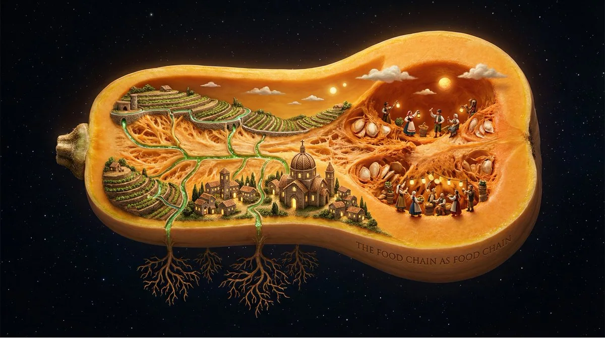 A single [FRUIT/VEGETABLE] suspended in space, sliced open to reveal it contains an entire agricultural civilization. Inside the fruit's flesh: terraced farms follow the curve of the rind, irrigation channels trace the paths of juice vessels, tiny farmers tend crops that are the fruit's own seeds, villages cluster near the core, harvest festivals celebrate in the chambers. The fruit's skin becomes their sky. Seasons pass in different sections simultaneously. Root structures below mirror branch structures of family trees. Everything edible is also everything lived. The interdependence of human and harvest made literal. Dramatic rimlight, agricultural amber and chlorophyll green, botanical illustration precision meets Bosch-like populated interior, 8K, the food chain as food chain. Check ALTs for ideas @AdobeFirefly