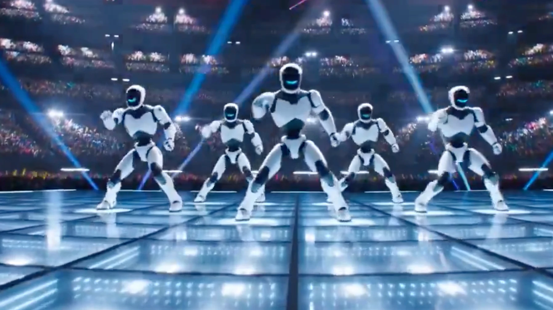 顶级科幻舞台大秀(Top-tier Sci-Fi Stage Show)。8K超高清,高帧率动态捕捉质感。 核心风格:未来赛博娱乐(Cyber Entertainment)。将机械的精密感与人类肢体的柔韧性完美结合。 动作设计:融合街舞(Hip-hop Dance)、极限跑酷空翻(Acrobatic Somersaults)与中国武术(Chinese Martial Arts)。 光影氛围:全息投影舞台(Holographic Stage),配合动感频闪的镭射激光(Laser Lights)和舞台冷烟花(Cold Pyrotechnics)。 【场景】 一个巨大的未来体育场中央舞台。地面是发光的LED网格地板。背景是无数挥舞着荧光棒的模糊观众席。 【角色设计(非IP原创机甲)】 “幻影舞者”小队(Phantom Dancer Squad):由五台流线型、极度敏捷的仿生人形机器人组成。机体采用亮白色陶瓷装甲与黑色碳纤维肌肉束,头部带有律动的音轨LED面罩(Audio EQ LED Visor)。 【分镜脚本】 [00:00-00:05] 镜头1:齐舞爆发·极限空翻 机位:舞台正前方低角度推轨(Low-angle Dolly In)。 动作:五台机器人在动感的镭射灯下进行着极度整齐的机械机械舞(Robot/Popping Dance)。突然,两侧的机器人向后滑步退开,C位(中心)的机器人向前极速助跑,连续完成三个完美的**凌空后空翻(Triple Backflips)**。 视觉奇观:机器人的金属关节在旋转中拉出蓝色的光学残影,每一次落地都精准踩在LED地板的节奏点上,激起一圈发光的数字涟漪。 [00:05-00:10] 镜头2:画风突变·武术阵列 机位:斯坦尼康环绕跟拍(Steadicam Orbit Shot)。 动作:空翻落地瞬间,五台机器人无缝切换动作风格,摆出经典的**少林武术起手式(Shaolin Martial Arts Stance)**。它们动作整齐划一,打出一套刚猛的连环拳和侧踢。 细节:虽然是钢铁之躯,但动作如行云流水(柔韧性极佳)。挥拳的速度在空气中打出白色的气流轨迹,展现出极致的机械动力学美感。 [00:10-00:15] 镜头3:终极定格·烟花谢幕 机位:超广角仰拍接慢动作(Ultra-wide Low-angle to Slow-mo)。 动作:高潮部分。四台机器人同时腾空,在空中做出高难度的**旋风踢(Tornado Kicks)**。C位的机器人在中央凌空劈叉落地,单拳砸向舞台地板——**超级英雄落地姿势(Superhero Landing)**。 氛围爆发:落地的瞬间,舞台后方喷射出十几道数十米高的**金色冷烟花瀑布(Gold Cold Pyrotechnic Fountains)**。所有的灯光瞬间汇聚在它们极具张力的武术定格姿态上,机械面罩上的LED律动达到最高频。