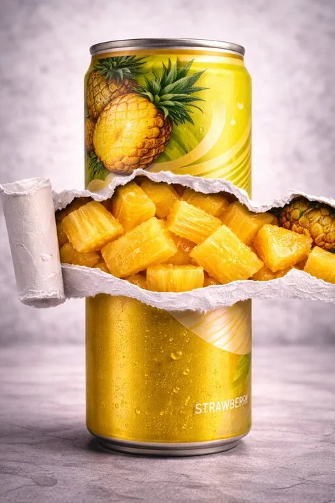 { "resolution_target": "8K", "image_type": "带有概念性剖面图的工作室产品摄影", "orientation": "纵向", "overall_description": "一张纵向的工作室照片,展示了一个金属饮料罐,上面标有“Borjomi Flavored Water”字样。罐体完好无损,但被一个水平的撕纸剖面图视觉上切开,露出了里面密密麻麻的红色石榴籽。场景极简、细节丰富、光线锐利,强调了金属、纸张和水果之间的纹理对比。", "primary_subject": { "object": "铝制饮料罐", "brand_text_visible": "BORJOMI", "product_text_visible": [ "FLAVORED WATER", "без сахара" ], "additional_text_visible": "“FLAVORED WATER”下方有西里尔字母文字(具体文字不完全清晰)", "material": "拉丝金属铝", "shape": "标准圆柱形罐", "top": { "type": "标准罐盖", "finish": "银色金属", "pull_tab": "从这个角度看不到" }, "label_design": { "base_colors": [ "银色", "浅粉色", "柔和的淡紫色" ], "graphics": "罐体上半部分附近有石榴插画", "typography": "“BORJOMI”采用粗体无衬线字体,罐体右侧有垂直排列的字母", "layout": "品牌名称垂直对齐;产品描述水平对齐,位于罐体中部偏下区域" } }, "cutaway_element": { "type": "水平撕裂剖面", "position": "罐体中央,从左边缘延伸到右边缘", "appearance": { "outer_edges": "白色、粗糙、纤维状的撕纸纹理", "thickness": "厚纸层,边缘不规则锯齿状", "depth": "视觉上看起来完全切开了罐体" }, "interior_content": { "object": "石榴籽(假种皮)", "color": "深红色至宝石红色", "translucency": "略带半透明,有光泽的高光", "density": "紧密堆积,填满了整个水平开口", "surface_detail": "单个籽粒清晰分离,反光,湿润外观" } }, "color_palette": { "dominant_colors": [ "银色", "浅粉色", "深红色" ], "accent_colors": [ "白色", "深海军蓝或黑色(文字)" ] }, "lighting": { "style": "柔和的工作室照明", "direction": "正面光带轻微顶部照明", "shadows": "罐体下方有柔和、漫射的阴影", "highlights": "金属表面和光泽水果籽粒上有清晰的镜面高光" }, "background": { "color": "浅灰色", "texture": "微妙的云状或混凝土状渐变", "focus": "失焦,平滑背景" }, "surface_and_environment": { "surface": "灰色平面桌面", "texture": "哑光,略带纹理", "reflection": "极少或没有" }, "camera_and_compos": "" }