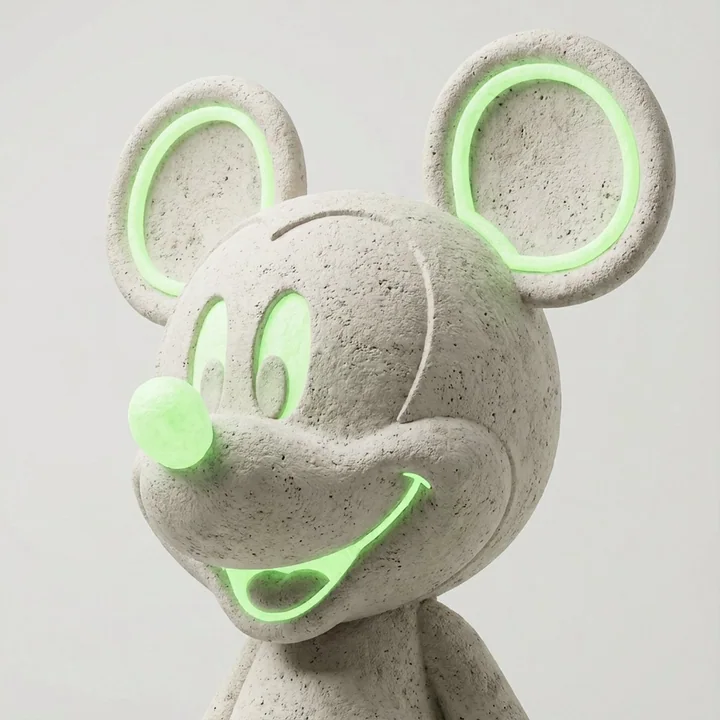 Close-up three-quarter bust sculpture of [Character Name] carved from grey-white travertine limestone. Head fully visible, no part of the head cropped. Hair and top of head completely inside the frame. Cropped at upper chest level. Shoulders clearly visible. Head and shoulders fill the frame without cutting the top. Tight framing but full head preserved. Three-quarter angle, slight 30-degree head turn. Natural sculptural posture. Material: grey-white travertine limestone. Chalky matte surface, dry stone texture. Fine porous micro-holes, natural pitting, subtle mineral speckles. Soft micro-roughness, powdery stone feel. Uniform light grey tone. No marble veins. No ceramic look. No resin look. No plaster look. No glossy surface. No waxy finish. No polished stone. Eyes include sculpted eyeball structure. Visible iris and pupil carved in stone. Not hollow eye sockets. Not empty eyes. Soft stone-carved iris detail. Natural stone eye depth without being realistic flesh. Eyes remain sculptural but not scary. High-key studio lighting. Bright but soft exposure. Clean luminous atmosphere. Lifted overall shadows. Soft recessed shadows in carved areas. Gentle cavity shading around eyes and under chin. Subtle ambient occlusion. No dark dramatic contrast. No deep black shadows. Background: neutral light grey seamless studio backdrop. Clean, minimal. No gradient. No vignette. No texture. Neon green glow appears only on 1–3 authentic character features. Glow follows original character traits only. No decorative lines. No circuit patterns. No extra glowing elements. Glow can appear as soft luminous surface areas. Controlled intensity. Pure clean neon green. Glow does not overpower the stone texture. Only grey-white stone and neon green. No additional colors. Ultra-detailed 3D sculpt render. Photorealistic limestone texture. Museum presentation style. Minimal aesthetic. Sharp focus. No depth of field blur. No text. No watermark. No logo.