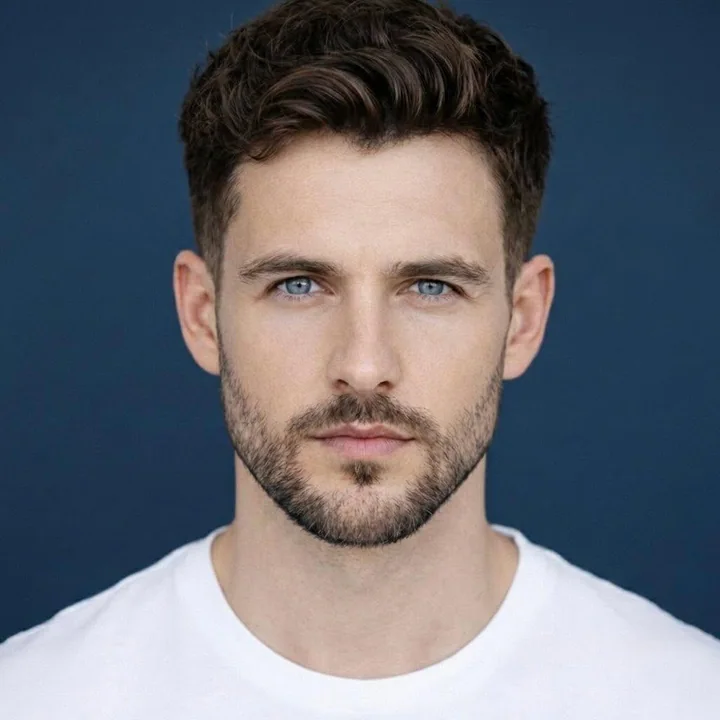 Ultra-realistic close-up portrait of a handsome young man with sharp facial features, light blue eyes, short textured brown hair, and a well-groomed beard, wearing a plain white t-shirt, centered composition, neutral expression, studio lighting with soft shadows, clean solid blue background, high detail skin texture, 85mm lens, shallow depth of field, professional headshot, 8K, cinematic color grading.