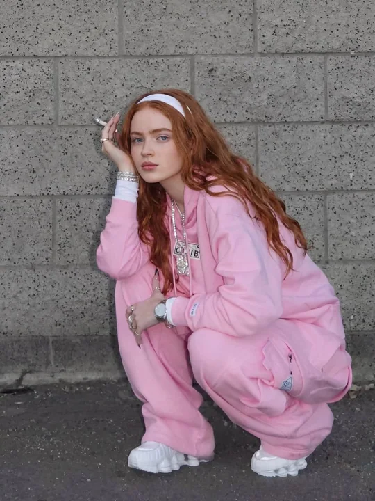 "A high-resolution, full-body portrait of a young woman with long, voluminous, vibrant red hair and a white headband, squatting down confidently against a textured grey cinder block wall. She is dressed in a cozy, oversized light pink hooded sweatshirt and matching jogger sweatpants, with a white long-sleeve shirt visible underneath the hoodie. She is accessorized with several sparkling silver rings on her fingers, a thick silver watch on her left wrist, and a prominent, shiny silver pendant necklace over the hoodie. She is looking directly into the camera with a serious, stoic expression, holding a thin white object between her fingers near her face. The lighting is soft and even, highlighting the texture of her hair and the soft fabric of the pink loungewear, capturing a candid, urban fashion aesthetic."