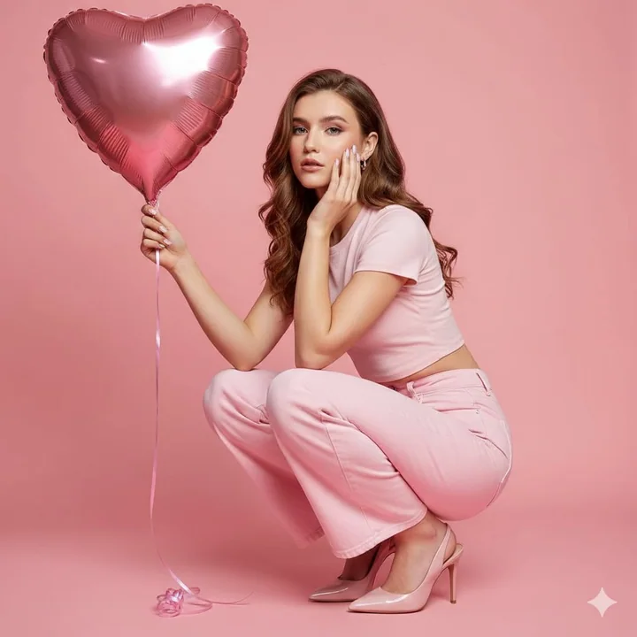 امرأة شابة مذهلة من آسيا جنوبية، ذات شعر بني طويل مموج، مكياج أنيق، عيون دخانية خفيفة وميضان شفاه لامع، تجلس في وضعية ممتعة على الأرض مع انحناءات ركبتها، وترتدي قميصًا قصيرًا بلون الوردي الفاتح مع أكمام قصيرة يكشف عن منتصف البطن، وبنطلون جينز واسع الفخّات ومرتفع الخصر بلون الوردي الفاتح، وحذاء رياضي بملامح حادة بلون الوردي الفاتح ذو كعب عالي، وتحمل في يدها اليمنى بالون قلب معدني لامع مغطى بورق معدني وشريط وردي طويل، بينما تضع يدها اليسرى على خدها في وضعية متأملة ورقيقة، خلفية استوديو دافئة بلون الوردي اللطيف، نمط تحرير صورة أزياء، جو رومانسي لعيد الميلاد، تصوير فوتوغرافي عالي الجودة، إضاءة احترافية، تفاصيل حادة، تدرج ألوان سينمائي، واقعي للغاية، 8k، تفاصيل دقيقة للغاية.