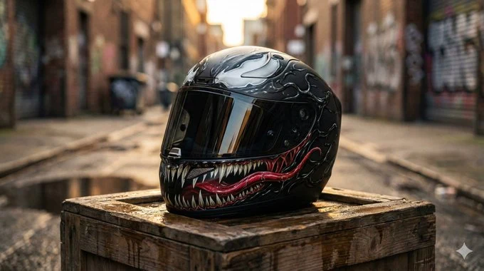 Ultra high-definition professional photography work, [motorcycle helmet] paint effect image, designed in [Venom movie character style]. Product details: - [Product type: car/motorcycle/bicycle/helmet etc.] - Paint style: [specific description of color, pattern, theme] - All license plate numbers are completely blurred and unrecognizable - Maintain the original contour and structural characteristics of the product Visual effects: - 8K ultra-high definition resolution - Professional commercial photography level - Perfect lighting effects and reflection details - Paint texture is realistic and natural, no PS traces - Metallic paint/matte texture authentically restored Scene environment: - [Natural environment: mountain road/seaside/forest/city street/race track etc.] - Golden hour soft light - Depth of field effect highlights the subject - Environment and product perfectly integrated - Professional photography composition Technical parameters: - Photography equipment: professional camera shooting effect - Lens: 85mm f/1.4 large aperture - Natural light, soft shadows - Cinematic color grading - Ultra-realistic rendering, photographic quality Forbidden elements: cartoon style, excessive PS traces, unrealistic light effects, clearly visible license plate numbers 超高清专业摄影作品,[摩托车头盔]涂装效果图,采用[毒液电影形象风格]设计。 产品细节: - [产品类型:汽车/摩托车/自行车/头盔等] - 涂装风格:[具体描述颜色、图案、主题] - 所有车牌号码完全模糊处理,无法识别 - 保持产品原有轮廓和结构特征 视觉效果: - 8K超高清分辨率 - 专业商业摄影级别 - 完美的光影效果和反射细节 - 涂装纹理真实自然,无PS痕迹 - 金属漆面/哑光质感真实还原 场景环境: - [自然环境:山路/海边/森林/城市街道/赛道等] - 黄金时段柔和光线 - 景深效果突出主体 - 环境与产品完美融合 - 专业摄影构图 技术参数: - 摄影器材:专业相机拍摄效果 - 镜头:85mm f/1.4 大光圈 - 自然光线,柔和阴影 - 电影级调色 - 超真实渲染,照片级质量 禁止元素:卡通风格、过度PS痕迹、不真实光效、清晰可见的车牌号