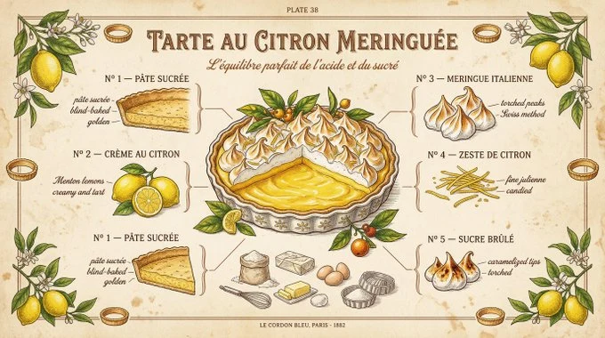 [DISH]のヴィンテージ植物学的および解剖学的イラストスタイル、19世紀フランスの料理百科全書から描かれたかのように。古びたパーペメント背景に、わずかなフォクシングとテクスチャー。すべての食材が精緻な手描きのディテールで描かれている:クロスハッチング、ドットペインティング、自然な食品カラーの水彩のウォッシュ。分解図で、各コンポーネントがエレガントなコップレートスクリプトでラベル付けされ、手描きの括線付き:「Nº [X] [INGREDIENT NAME]」、下部には小さなカーソル体の準備ノート。中央のヒーロー料理は温かみのあるフルカラーで描かれ、周囲の食材の研究図はセピアとカラーのミックスメディアで表現。装飾的な枠には料理モチーフが描かれる。タイトルは豪華なオフセットプレス体で:「[DISH NAME]」。サブタイトルはイタリック体のコップレートで:「[TAGLINE]」。ムード:1880年のレコルトブルーとラロス・ガストノミックの融合。超詳細、豊かな温かみのあるトーン、非凡な。