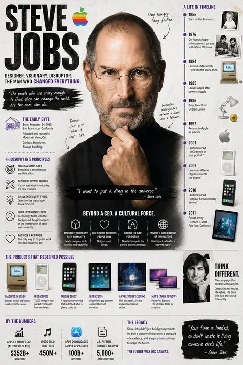 Create a visually rich infographic about [PERSON NAME]. Start by researching his life, major achievements, career milestones, philosophy, and unique impact on technology and design. Present information through annotated visuals and structured callouts, not generic sections. Style it like a bold graphic illustration: a detailed, photorealistic central portrait as the focal point, supported by timelines, diagrams, product references, quotes, and concise text elements. Use clean backgrounds and a mix of photorealism with strong graphic elements (shapes, icons, color blocking) in a layered composition. Make it dense, tactile, and professionally authored.