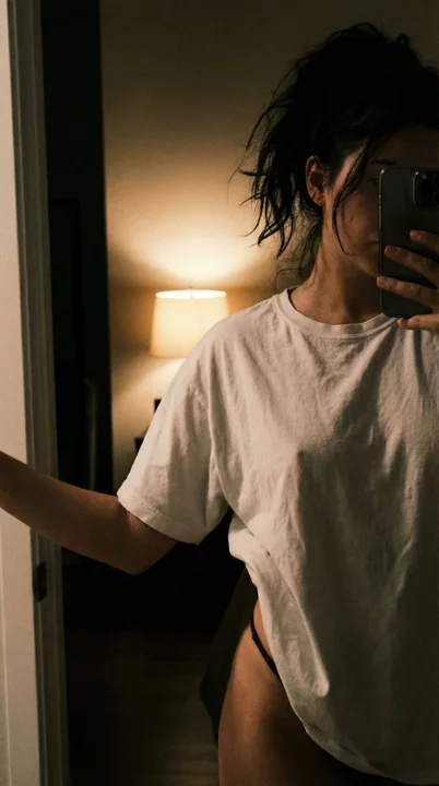 { "type": "ultra_realistic_portrait", "style": "cinematic, intimate, moody", "resolution": "8K", "aspect_ratio": "2:3", "camera": { "angle": "mirror selfie perspective", "framing": "mid-torso crop, partial face visible", "lens": "50mm prime lens", "depth_of_field": "shallow depth of field, soft background blur", "focus": "sharp focus on subject's upper body and fabric texture" }, "lighting": { "type": "warm ambient indoor lighting", "source": "bedside table lamp behind subject", "color_temperature": "tungsten warm tones", "mood": "soft, intimate, cozy evening atmosphere", "shadows": "natural soft shadows with gentle contrast" }, "subject": { "gender": "female", "age_range": "early to mid 20s", "pose": "standing in doorway, one arm extended touching door frame", "expression": "neutral, candid, slightly mysterious", "hair": { "style": "messy ponytail", "texture": "natural, slightly tousled", "color": "dark brown to black" }, "skin": { "tone": "natural medium tone", "texture": "realistic skin texture, visible pores", "details": "subtle natural imperfections" } }, "clothing": { "top": { "type": "oversized white t-shirt", "fit": "loose, relaxed fit", "fabric": "soft cotton", "details": "slightly wrinkled, natural fabric folds" }, "bottom": { "type": "minimal black underwear", "visibility": "partially visible under t-shirt hem" } }, "environment": { "location": "bedroom interior", "elements": [ "bedside lamp with fabric shade", "dark wooden floor", "dim background room", "mirror reflection" ], "aesthetic": "minimal, cozy, evening home setting" }, "composition": { "rule_of_thirds": true, "negative_space": "dark background enhances subject silhouette", "cropping": "face partially obscured by smartphone" }, "mood_keywords": [ "intimate", "authentic", "candid", "moody", "warm", "natural" ], "quality_tags": [ "photorealistic", "high detail", "cinematic color grading", "natural skin tones", "professional photography" ] }