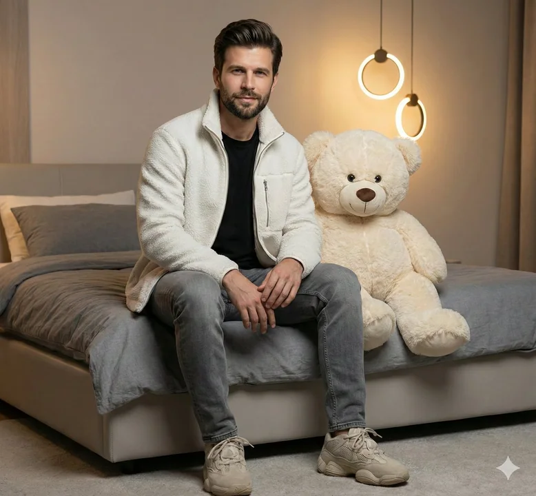 A highly realistic portrait of a stylish young man sitting comfortably on the edge of a modern bed. He is wearing a premium white textured fleece jacket over a black t-shirt, paired with grey denim jeans and beige chunky sneakers. Next to him is a large, cute cream-colored teddy bear. The room has soft, warm ambient lighting with modern circular pendant lights in the background. High-quality photography, 8k resolution, cinematic lighting, sharp focus on facial features." 一张高度逼真的肖像照,一位时尚的年轻男子舒适地坐在现代床的边缘。他身穿一件优质的白色纹理抓绒夹克,内搭黑色 T 恤,下身是灰色牛仔裤和米色厚底运动鞋。他旁边放着一只可爱的大号米色泰迪熊。房间里有柔和温暖的环境照明,背景是现代圆形吊灯。高质量摄影,8k 分辨率,电影级灯光,面部特征清晰对焦。