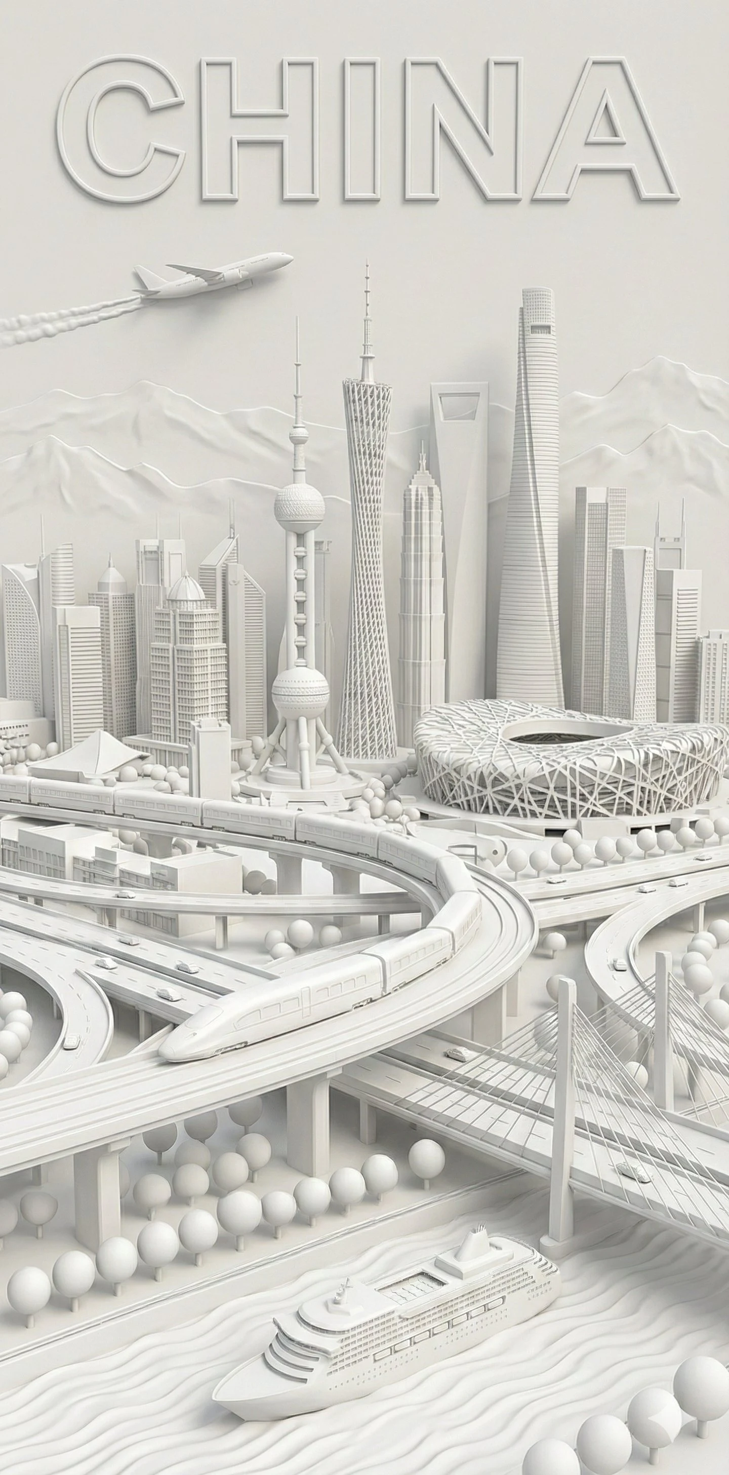 A highly detailed 3D bas-relief poster design representing [CITY_NAME]. A dense collage composition featuring the most iconic landmarks and skyline of [CITY_NAME]. Foreground filled with local transportation systems, busy highway networks with miniature cars, and native vegetation. At the top, features prominent, large, embossed English text in capital letters spelling out the name of the location. Pure white monochromatic clay render, embossed paper texture, soft studio lighting, high visual density, clean commercial illustration style. --ar 1:2 一个高度精细的3D浅浮雕海报设计,代表[CITY_NAME]。一个密集拼贴构图,展示[CITY_NAME]最具标志性的地标与天际线。前景填满本地交通系统、繁忙的高速公路网络与微型汽车,以及原生植被。顶部以大型凸起英文大写字体呈现地点名称。纯白色单色黏土渲染、凸版纸张纹理、柔和工作室布光、高视觉密度、简洁商业插画风格。 --ar 1:2