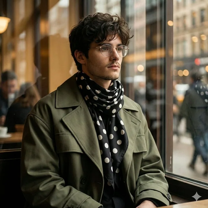 一位年轻男士的时尚编辑肖像照,他戴着一条宽大的真丝围巾,上面印有大胆的高对比度波点图案,围巾披在一件由哑光橄榄绿科技面料制成的结构感超大风衣上。造型突出了利落的垂坠感、鲜明的结构和丰富的纹理对比。场景设定在一个繁忙的城市咖啡馆,透过反光玻璃窗望去,窗户营造出柔和的双重曝光效果,伴随着光线轨迹和倒影。低调的电影式环境光线呈现出温暖的棕褐色和赭石色调,窗户的光晕作为柔和的补光。整体氛围现代、内敛且极具时尚感,具有逼真的电影细节和丰富的纹理渲染。