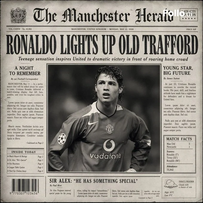 Create the most realistic front page design of a vintage newspaper featuring the main character. The layout should be made in the style of a real printed newspaper with a cinematic black-and-white aesthetic. The main photo should be prominently placed in the center, framed, like the image in the title of the article. The subject in the photo should remain unchanged and clearly distinguishable in natural light and slightly increased contrast in order to match the spectacular editorial style. Create a bold, attention-grabbing headline at the top (create a unique title that matches the spirit of the photo - it can be romantic, mysterious, funny, or dramatic). Add a smaller subtitle under it, which will look like a real newspaper caption. Add realistic newspaper elements: Columns of small text (in the style of lorem ipsum, but framed like real news) At the top is the fictitious name of the publication (for example, “The Daily Prompts”, “AI Times” or similar - think creatively, according to the picture) Date, issue number and location Decorative lines, dividers, and vintage typography Small additional articles or captions to the main image Optional stamps, doodles, or editorial notes to add personality. Style: Black and white or slightly faded monochrome paper Fine paper texture, grain, and ink defects Small shadows and creases that mimic real printed paper The aesthetics of a clean but slightly worn vintage newspaper Mood: Give the design personality, expressiveness and plot, as if the plot is part of the main article. Aspect ratio: 4:5 or 1:1 High-detail, ultra-realistic hybrid of editorial photography and print design.